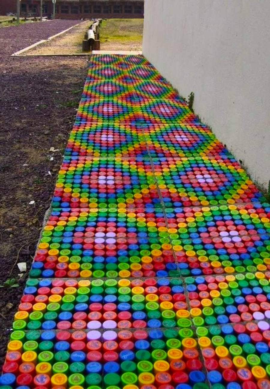 Лёгкие и долговечные пластиковые емкости служат превосходным материалом для оформления поверхностей садовых дорожек. Используя бутылки с различным оттенками, можно выкладывать оригинальные орнаменты, получая поверхность с высокой степенью декоративности. Используют также крышки или только донышки от пластиковой тары.