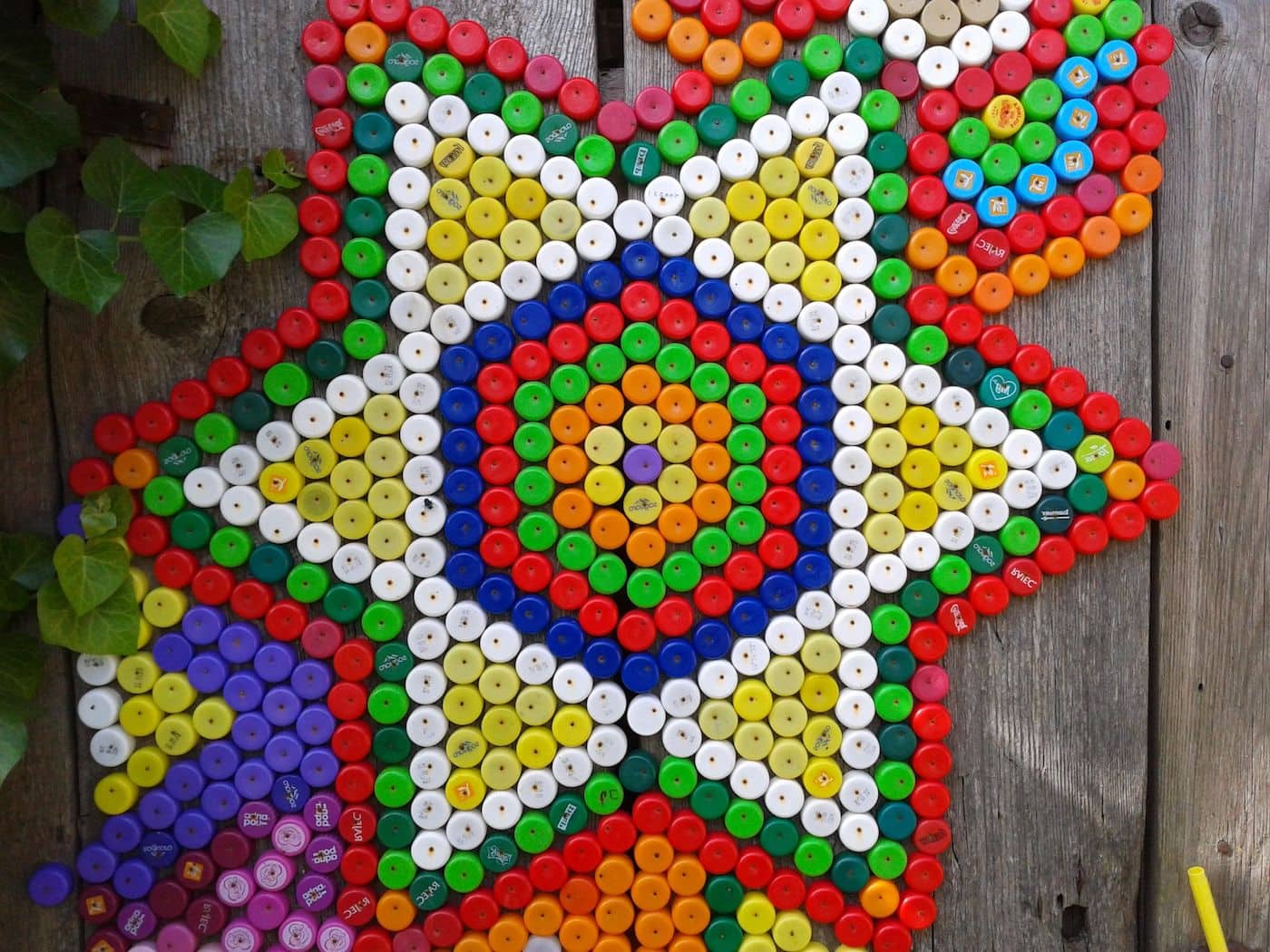 Для изготовления поделок своими руками на дачном участке можно использовать самые обычные пробки от пластиковых бутылок. Пробок понадобиться очень много, но при желании их можно найти. Из пробок от бутылок можно сделать очень красивые узоры, украшающие стены, заборы и многие другие элементы на дачном участке или рисунки животных. Фигурки и узоры из бутылочных пробок можно разрисовать красками в разные цвета, делая экспозицию еще более интересной. С их помощью можно создавать целые произведения искусства.