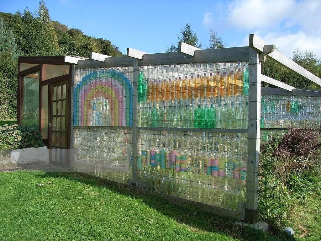 Из пластиковых бутылок можно даже соорудить забор, который будет нести не только защитную функцию, но и послужит одним из ключевых элементов декора ландшафта. Материал можно выбрать разного цвета или при необходимости его окрашивают.