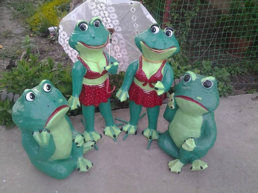 Возле водоёма уместен массивный бегемот или черепаха. Цемент, песок и плиточный клей соединяются в пропорции 1:2:1 и перемешиваются с водой до состояния густой сметаны. Учтите, что изделия длительно сохнут.