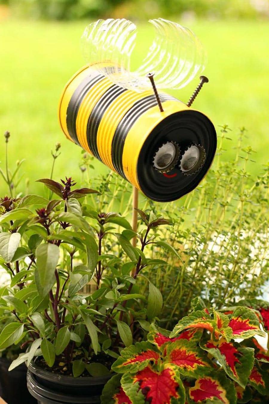 Пчелка из жестяной банки станет прекрасным дополнением для клумбы в саду