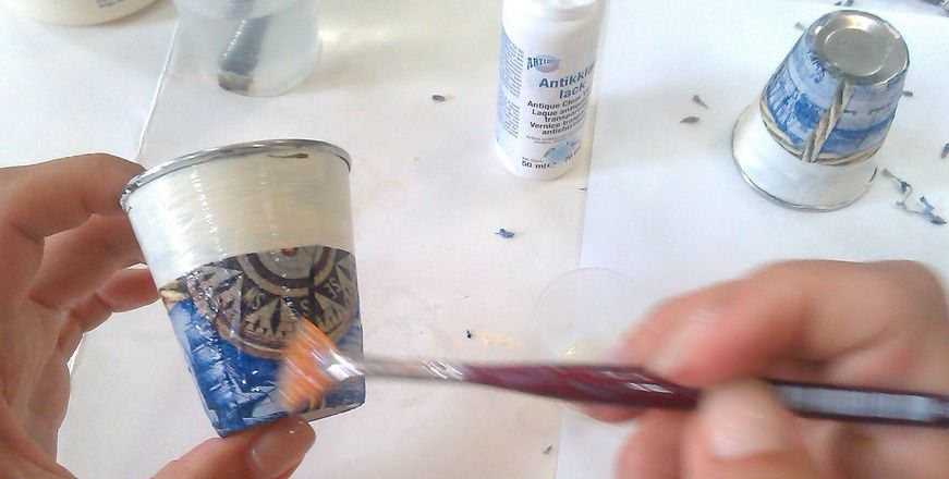 - Сделать декупаж, нанести финишный лак. Когда он подсохнет и станет липким, покрыть его лаком для кракелюра, высушить.