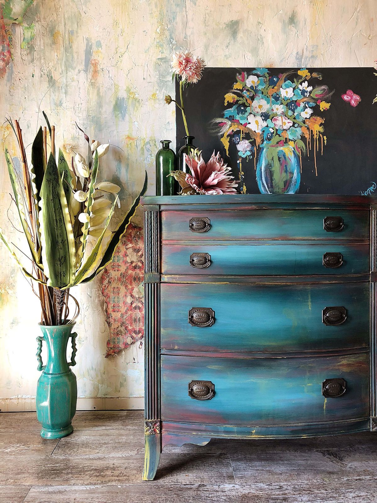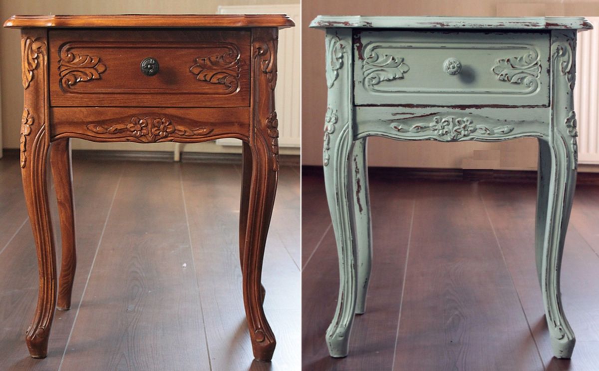 Используя этот метод, можно быстро добиться эффекта состаривания мебели, который характерен для стиля прованс. Нужно приготовить два вида краски: одна будет служить фоном, а другая — в качестве основного цвета.