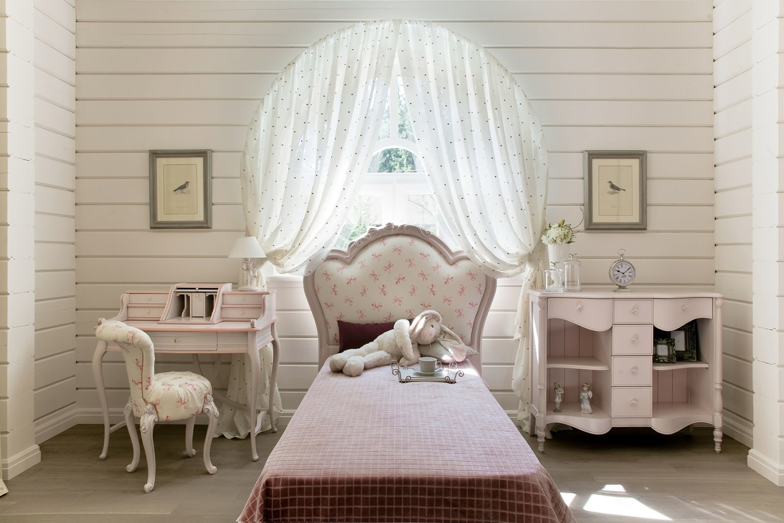 Стены детской комнаты украсят обои в цветочек или легкую клетку. Светлая мебель может быть отделана техникой декупаж или кракелюр. Многообразие декоративных прованс аксессуаров гармонично смотрятся в интерьере детской комнаты.