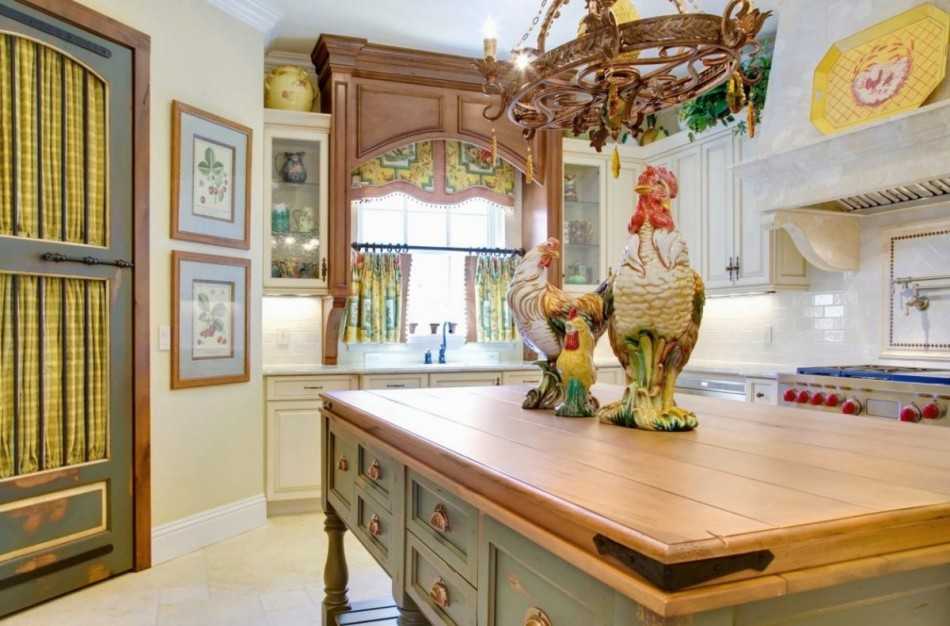 Идеальным вариантом будет объединенная кухня-столовая. Отделка стен выполняется штукатуркой светлого тона, нанесение грубое, с заметными неровностями и шероховатостями. Выбор напольного покрытия отдается в пользу дерева, паркета с имитацией дерева и плитки.