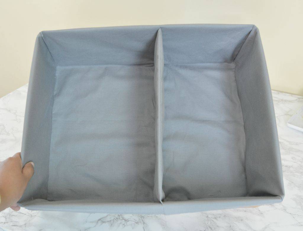 Из куска картона вырежьте донышко, чтобы мелкие предметы не закатывались под клапаны. Для него также сшейте тканевый чехол, чтобы можно было стирать. Наденьте чехол на донышко и вложите его внутрь органайзера. Выставьте перегородку.