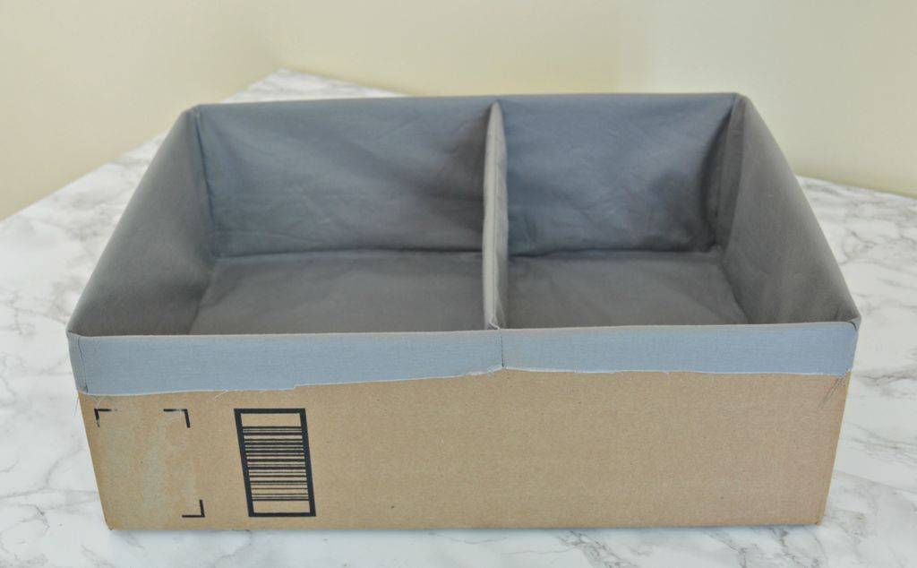 Используйте плотную, жесткую коробку подходящего размера. При помощи канцелярского ножа аккуратно и максимально ровно отрежьте верхние клапаны — крышку. Один из клапанов примерьте посередине коробки, чтобы он легко вставлялся и послужил основой для перегородки.