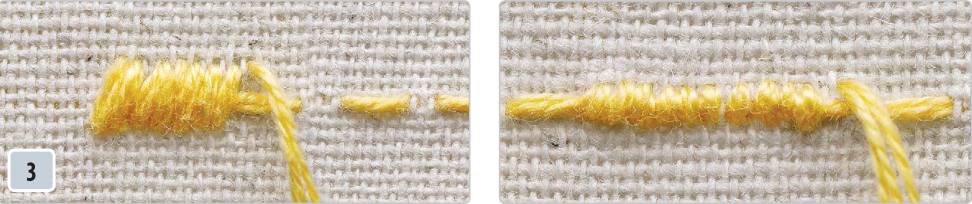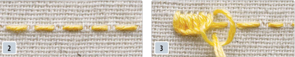 - Выведите иглу в точке 3, в середине первого стежка, оставляя нить над иглой.