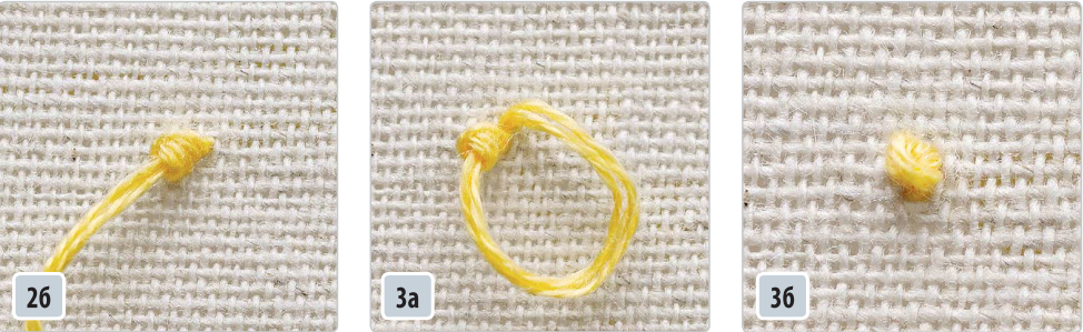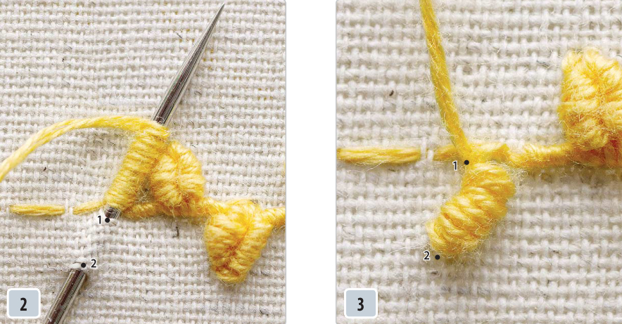 - Выведите иглу в точке 1. Введите иглу через точку 2 в точку 1 и дважды обвейте ее ниткой. Затяните стежок, придерживая навивки.