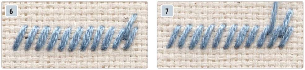 - Выведите иглу в точке 5, проложите стежок в точку 6. Повторите стежок.