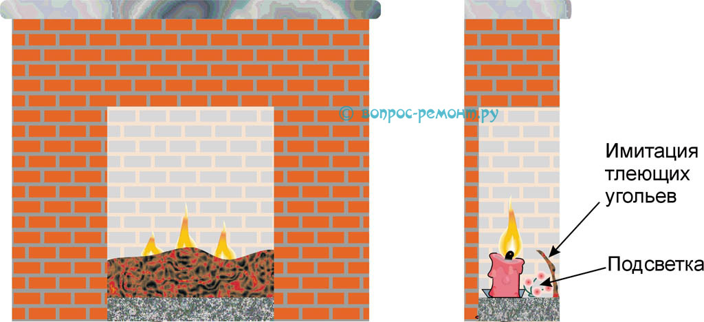 Далее занимаемся украшением внутренней части. Чтобы самодельный камин светился изнутри, используются ранее заготовленные электронные свечи, гирлянды или светодиодные ленты. Их можно сложить внутри и прикрыть искусственными дровами, что создаст эффект горения. Этот очаг сможет также выполнять функцию ночника.