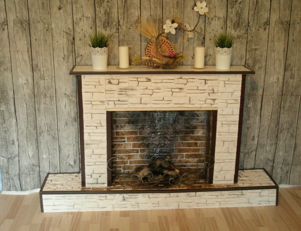 И последний этап – финишная отделка. Изначально наносится финишная шпаклевка, используя шпатель, а далее в ход вступает фантазия. Для начала наш новый самодельный бутафорский камин обклеивается с помощью бумаги. Декор нашего камина можно организовать пенопластовыми бордюрами, которые очень часто используют для оформления потолка. Так же можно создать декоративный камень, который окрашивается под декоративный камень. Крышка будет отлично смотреться, если ее выложить плиткой или оформит деревянной вагонкой. Завершить все великолепие можно покрытием лаком, для того чтобы зафиксировать и сохранить все оформление.
