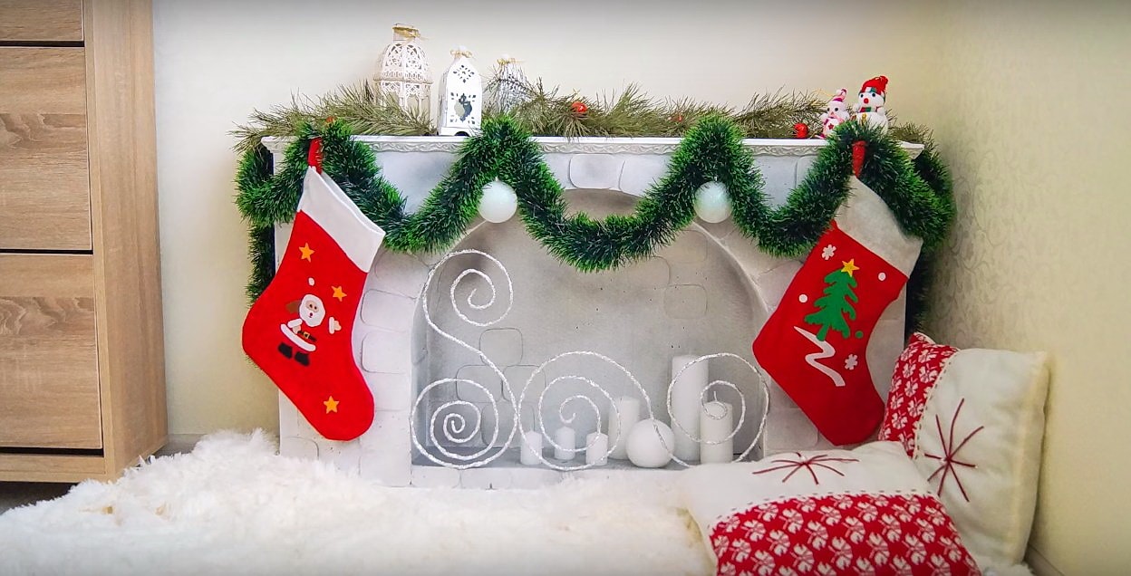 У многих из нас нет камина, но нет никаких препятствий чтобы на новогодние и рождественские праздники сделать искусственный камин своими руками. Вот простой пример, как сделать впечатляющий фальш камин из двух больших картонных коробок, склеенных вместе. Чтобы придать реалистичный вид камня, нанесите на «кирпичи» декоративную краску с эффектом камня.