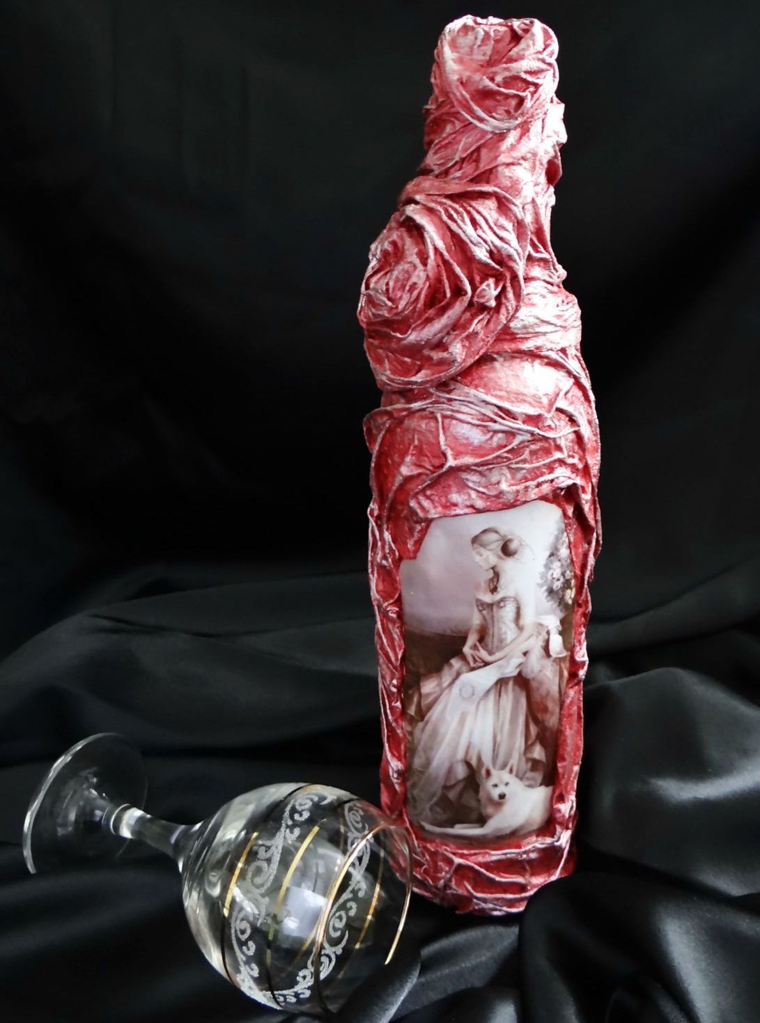 Бутылка, выполненная с помощью винтажного декупажа, станет хорошим подарком на любой праздник