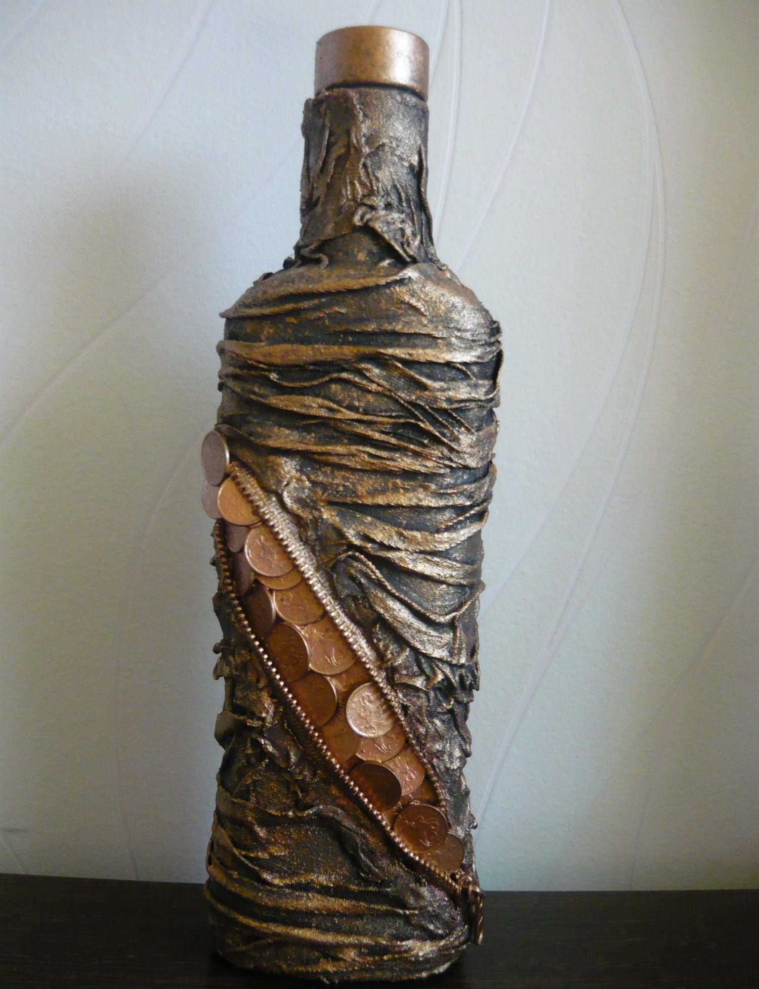 Таким способом можно осуществить декор вазы, сосуда неправильной формы или оформление бутылки коньяка для мужчины. Мастер-класс по созданию базового изделия заключается в следующем: