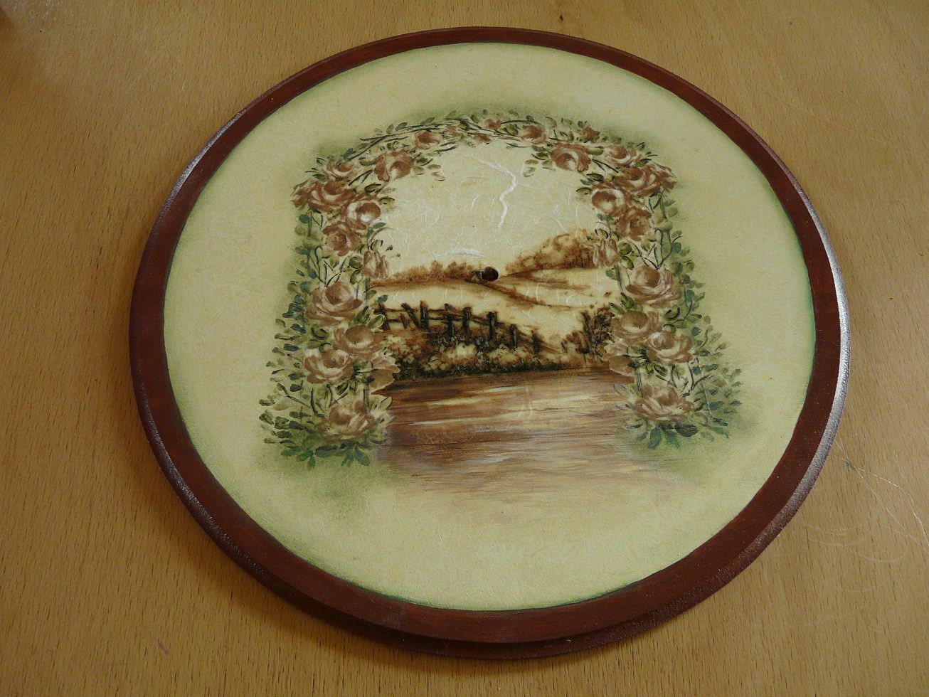 3. Нанесение рисунка. В качестве рисунка используют рисовые карты, они сделаны специально для декупажа. Если такой карты нет, то можно использовать обычные салфетки с понравившимся рисунком. Салфетки лучше выбирать те, у которых два или три слоя белой бумаги, а верхний представляет декоративный рисунок. Перед тем как нанести рисунок на основу, с салфетки снимают белый слой бумаги, оставляя только цветной. Из листа бумаги делают заготовку с таким же диаметром, как и внутренний круг деревянного циферблата. Затем рисунок накладывают на бумагу, и по окружности отмечают карандашом с припуском в 1 см. Рисунок обрывают по отмеченной линии. Рисунок накладывают на заготовку и приклеивают при помощи кисти и клея. Лишние части салфетки удаляют.