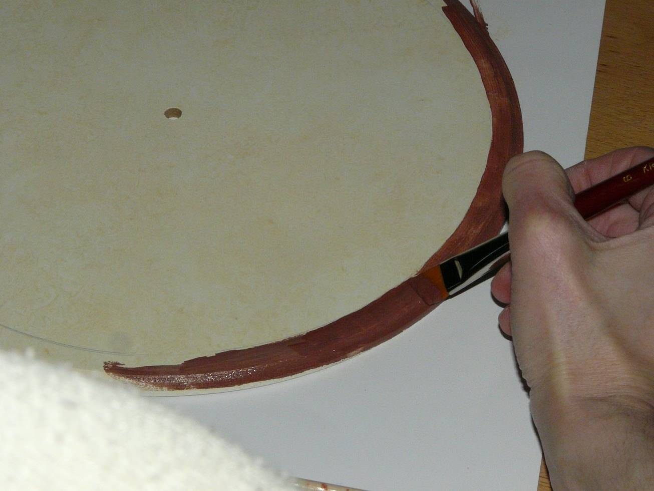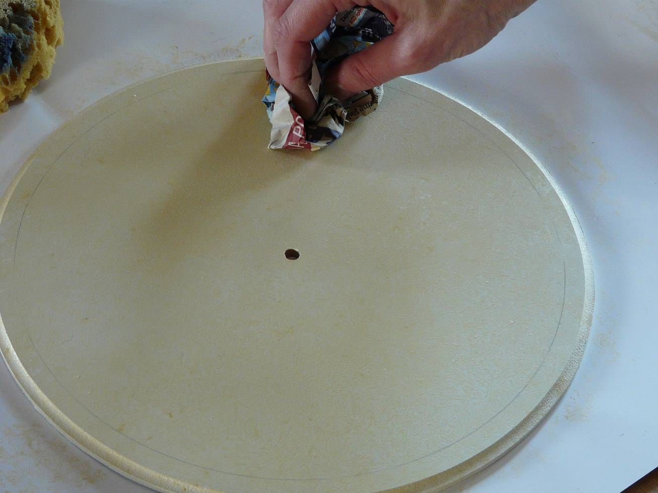 1. Подготовка основы. Для того, чтобы поверхность будущего циферблата была ровной и гладкой, предварительно заготовку нужно ошкурить наждачной бумагой. После работы поверхность и края должны быть гладкими. Если же неровности остались, то можно воспользоваться структурной пастой. Пальцем нужно нанести немного пасты на заготовку и разровнять, а после окончания работы оставить её просыхать на несколько часов. После просушки, ту область, где наносилась паста нужно снова ошкурить.