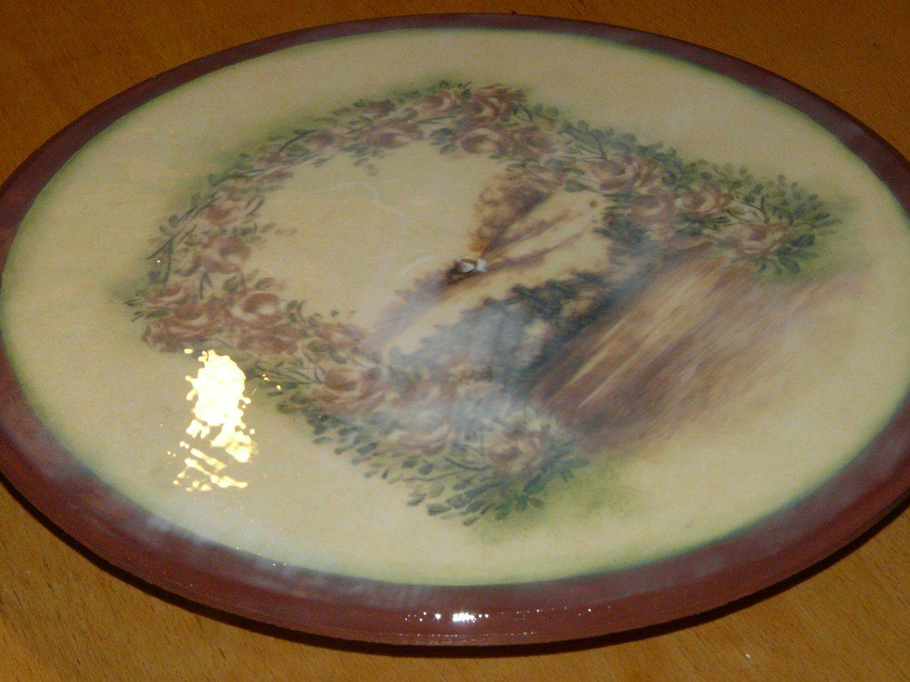 Далее вырезаем фрагмент из декупажной карты. Наносим на пластинку клей ПВА, мочим вырезанный фрагмент в воде и приклеиваем на середину пластинки. Сверху дополнительно смазываем клеем и убираем пузырьки с помощью тряпочки. Ждем полного высыхания.