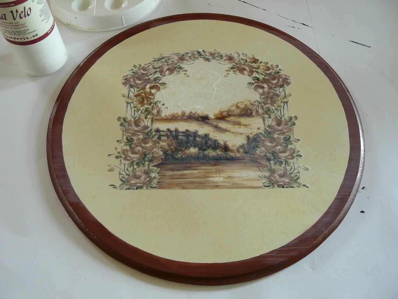 Выбираем стиль для фонового изображения, в зависимости от интерьера и ваших предпочтений. Приклеиваем картинку на основу. Можно использовать клей ПВА, разведенный с водой, или специальный клей для декупажа