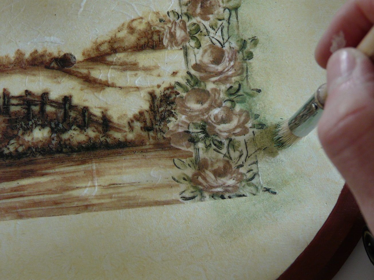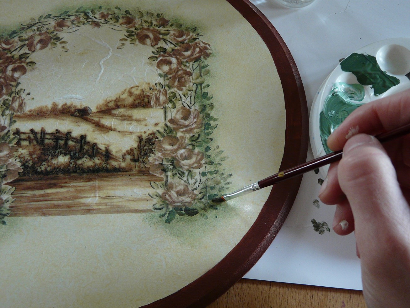 Когда краска подсохнет, выбирают подходящий по размеру рисунок, хорошо промазывают его клеем и аккуратно, не спеша, накладывают в определенное ранее место, тщательно расправляя. Сверху опять наносят слой клея, убирая оставшиеся пузырьки, неровности и шероховатости.