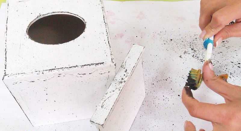 Если вам кажется, что состаривание не слишком естественное, можно сделать набрызг, с пособничеством старой зубной щетки и акриловой краски, как продемонстрировано на фото. В конце, наносится матовый акриловый лак.