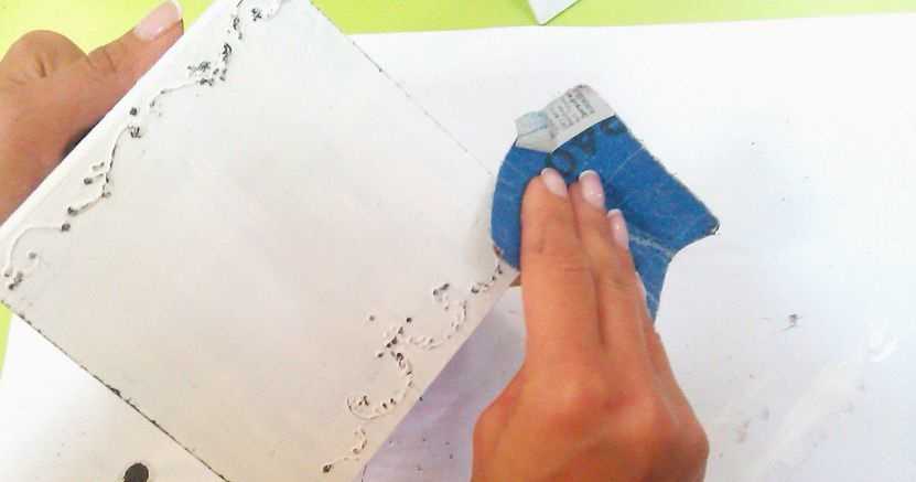 - После полного высыхания клея рисунок частично снимается наждачной бумагой средней зернистости;