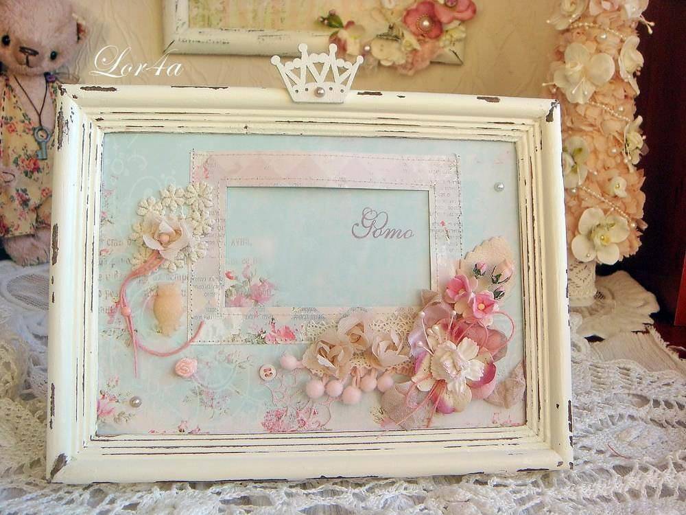 - Осталось дождаться высыхания и поместить произведение в рамку, которую тоже можно задекорировать в технике декупаж. Для этого окрасьте ее акриловой грунтовкой, нанесите лак-кракелюр, а после высыхания покройте поверхность рамки золотистой краской, чтобы выделить трещинки.