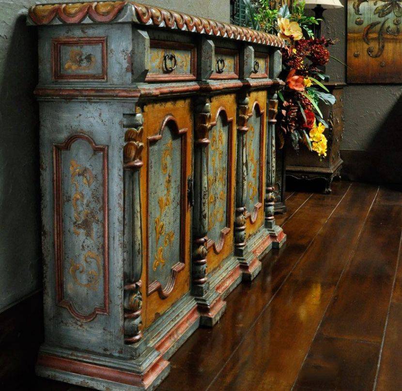 - патинирование – это намеренное затенение определенных участков на мебели или предметах (места частого соприкосновения – края и углы).