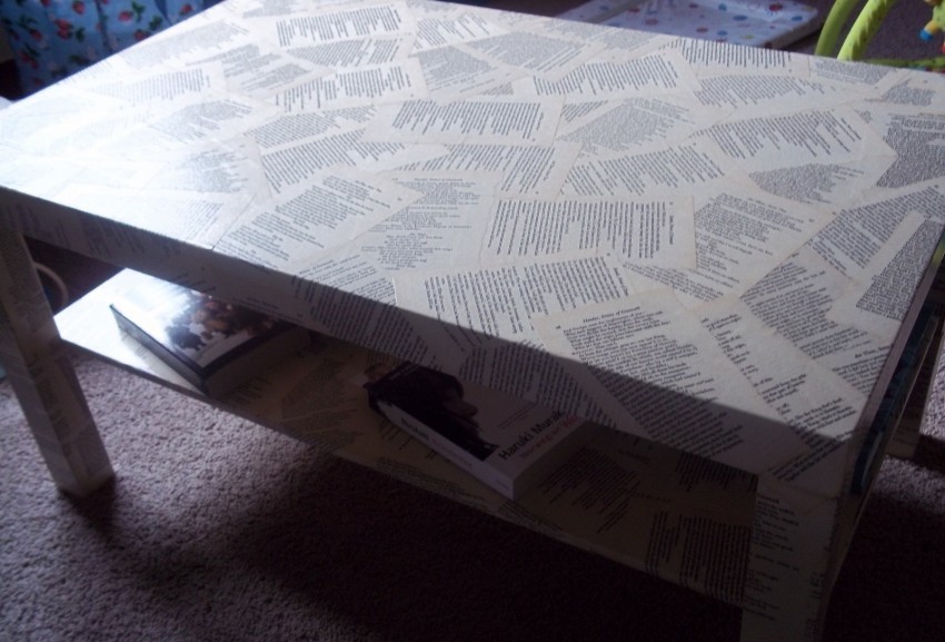 Опытные мастера использую для декупажа старого стола своими руками ткань, кружево, различные страницы книг и фотоснимки.