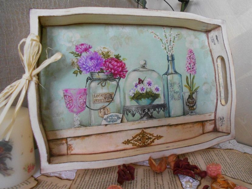Так как один из приемов изящного шебби-шик и является декупаж, чаще всего в прованском стиле используют именно эту технику. Прежде всего, прованс – это яркое противопоставление чопорному стилю города, это свежесть провинции, деревенский шик, размеренный и изящный. В стиле французской деревни много мелких деталей, его отличают обилие декора, цветочно-флористические мотивы. Поэтому фрагменты из салфеток с цветами, растениями великолепно подходят для данного дизайна, тем более что в стиле прованс преобладает белый цвет, а это самая универсальная основа для нанесения декора любого цвета и формы.