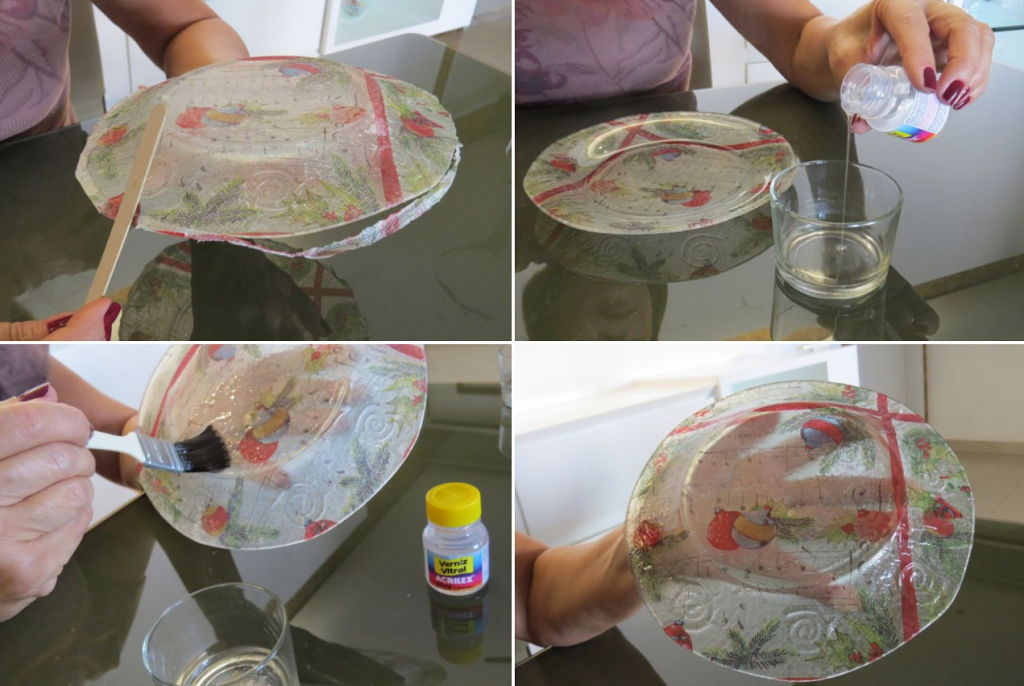 4. Разместив все изображения, хорошо промажьте клеем всю изнаночную сторону тарелки, затем оставьте сохнуть. После того как тарелка высохнет, необходимо обработать края, удалив выступающие кусочки бумаги. Сделать это можно ножницами или пилочкой для ногтей (последняя точно удалит все неровности по краям). Покройте парой слоев акрилового лака готовую тарелку.