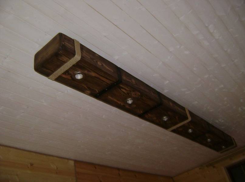 Из толстого цельного бруса можно создать деревянные люстры своими руками. Для этого нам нужны светодиодные лампы, которые встраиваются в натяжной потолок. Отмеряем нужную длину бруса. Покрываем лаком или морилкой. Высверливаем в брусе круглые отверстия под диаметр ламп. Устанавливаем излучатели на термостойкий клей.