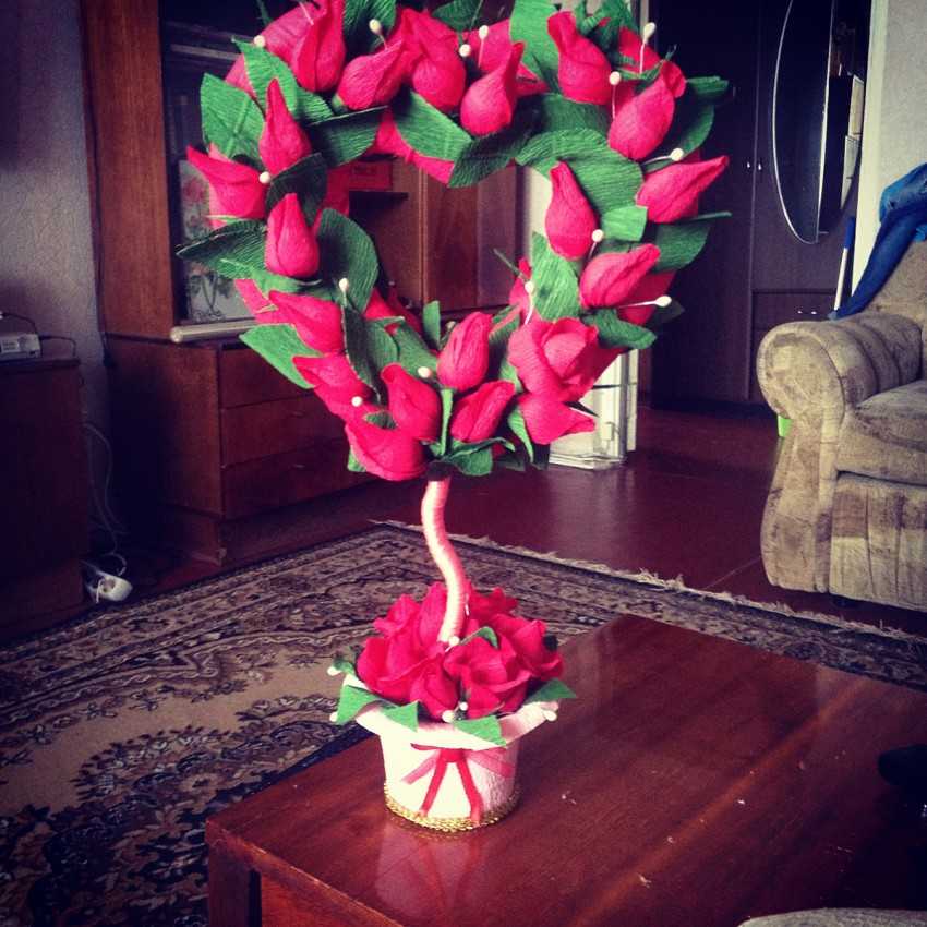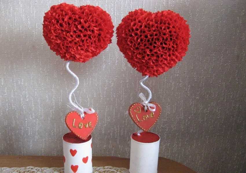 Сначала на плотном картоне рисуют и вырезают сердце. В зависимости от идеи оно может быть сплошным или в виде обрамления. Затем оклеивают газетой, пока оно не станет объёмным и оставляют до полного высыхания. Окрашивают в тот же цвет, из которого будут цветочки. Далее процесс работы такой же, как и с круглой кроной.