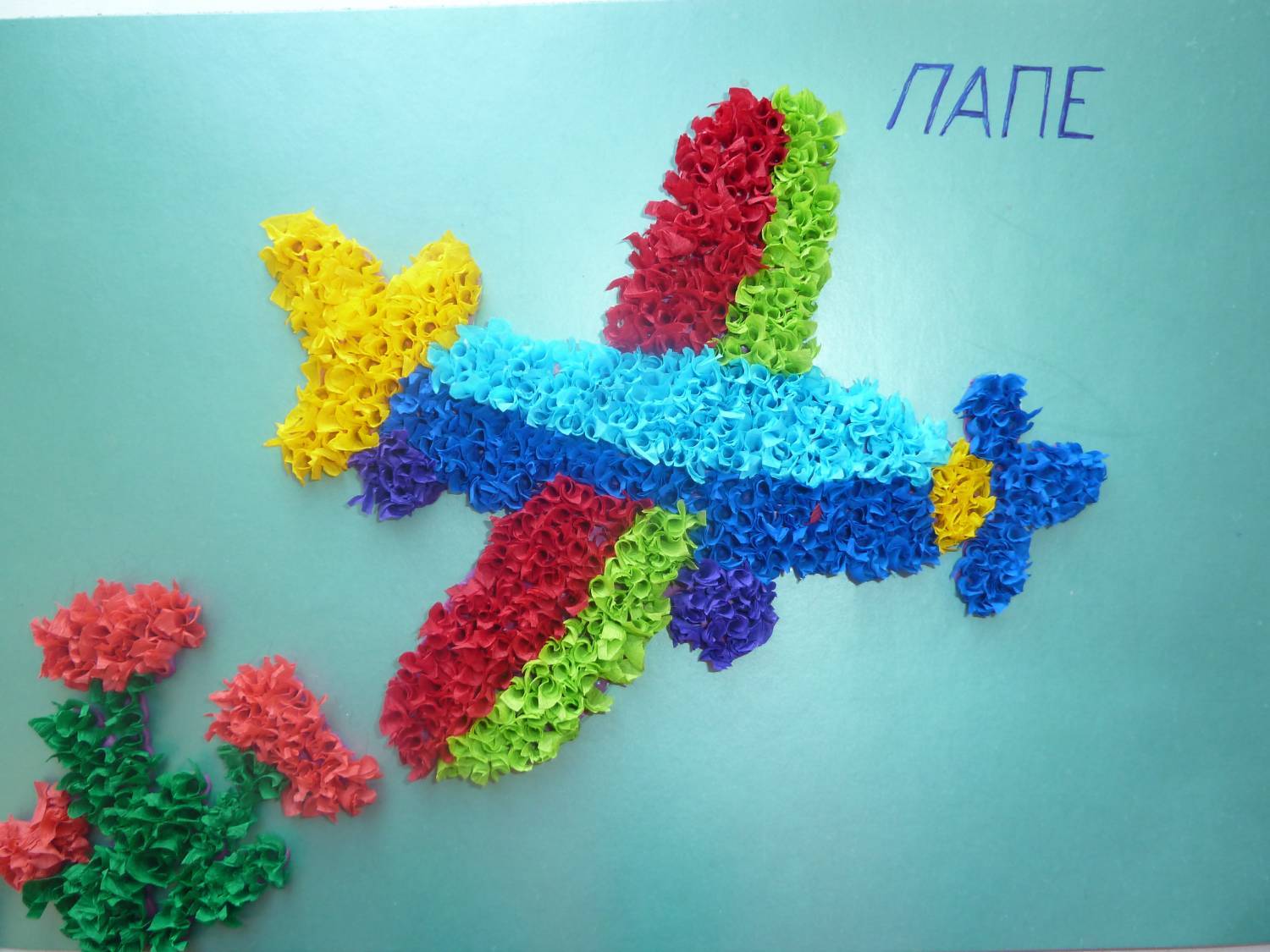 Если ваш папа любит небо — его порадует открытка с самолетом. На синий фон просто приклейте белый самолетик и солнышко. Облака лучше сделать объемными из обычной ваты.