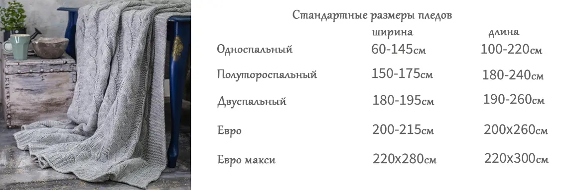 Вязаные пледы — это обширная категория, в которой перечисляются покрывала на кровать или диван гостиной (размер зависит от габаритов мебели). Они могут быть детские (тоже разные по величине — в кроватку, коляску, для заворачивания малыша, вместо конверта), для укрывания человека — стандартного или нестандартного размера.