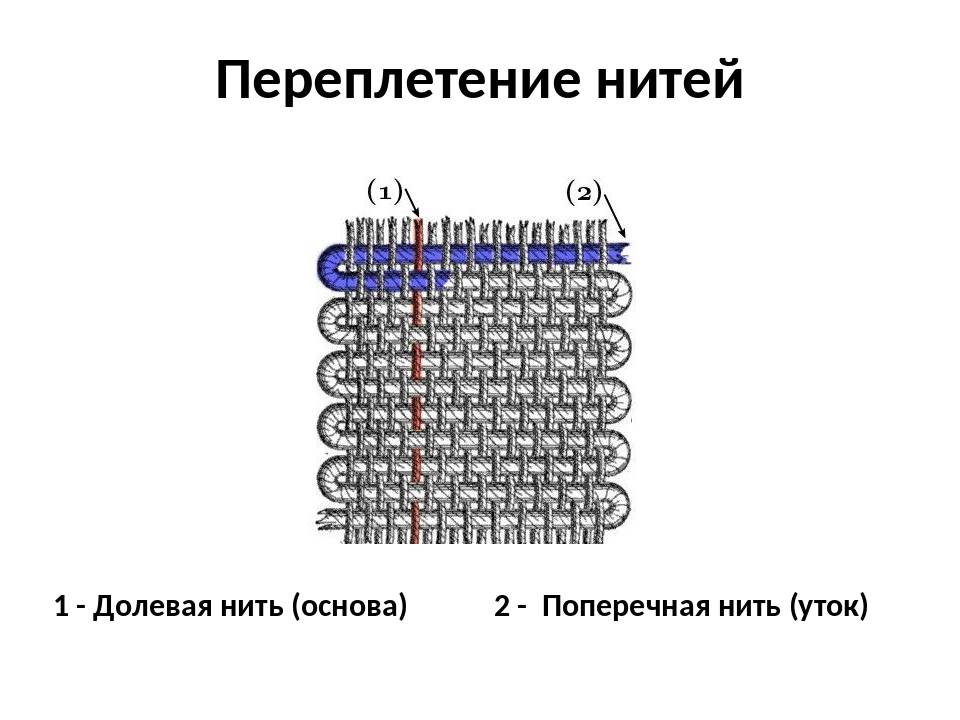 - Долевая нитка наиболее часто идет ровно, а поперечная поочередно ее огибает, показываясь то с лицевой, то с изнаночной стороны ткани (самое распространенное полотняное переплетение).