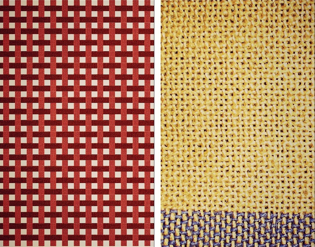 На рисунке схематично показано переплетение нитей в тканом материале. Синим цветом изображены долевые нити, которые идут вдоль всего полотна. Красные — уточные нити, которые образуют переплетение с основными нитями.
