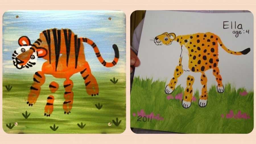 Ребенок намазывает на ладонь чередующимися полосами параллельно пальцам оранжевую и черную краску. Можно нанести только оранжевую, а после высыхания отпечатка на листе пальчиком сделать черные полоски. Отпечаток большого пальца можно увеличить, это будет голова тигра. На ней необходимо изобразить уши, глаза, нос. Остальные четыре пальца — лапы животного. Длинный тигриный хвост нужно подрисовать пальчиком.