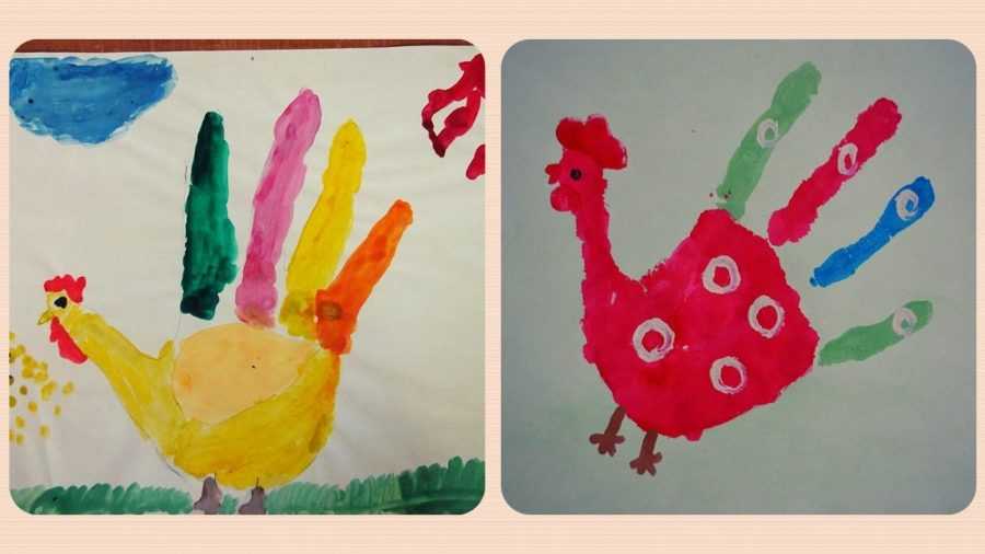 Перед началом занятия педагог предлагает воспитаннику вспомнить, какого цвета у петуха хвост, гребень, лапы, клюв. Ребенок окрашивает большой палец и середину кисти в один цвет: это туловище и голова птицы. А каждый из четырех остальных пальчиков покрывает разной краской, имитируя разноцветный петушиный хвост. Затем, направив ладонь горизонтально, прикладывает к бумаге. В завершение дошкольник изображает клюв, высокий гребень, глаза и лапы птицы.
