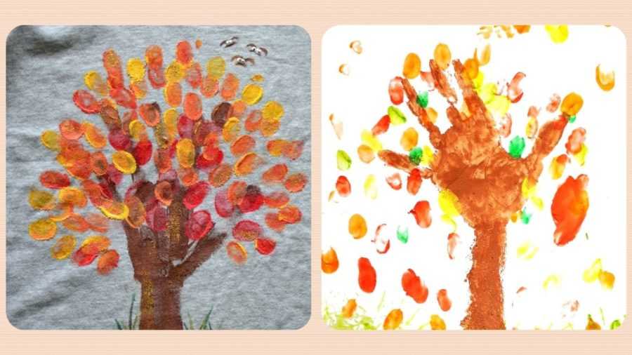 Перед началом работы с ладошками дошкольник сам или с помощью педагога рисует кисточкой ствол и ветви дерева. Затем распределяет по ладошке небольшими пятнами зеленую, салатовую, желтую краску. Можно также оранжевую и красную, если дерево будет осенним. Направив ладонь растопыренными пальцами вверх параллельно стволу, ребенок прижимает ее к его верхней части. Получается пышная крона.