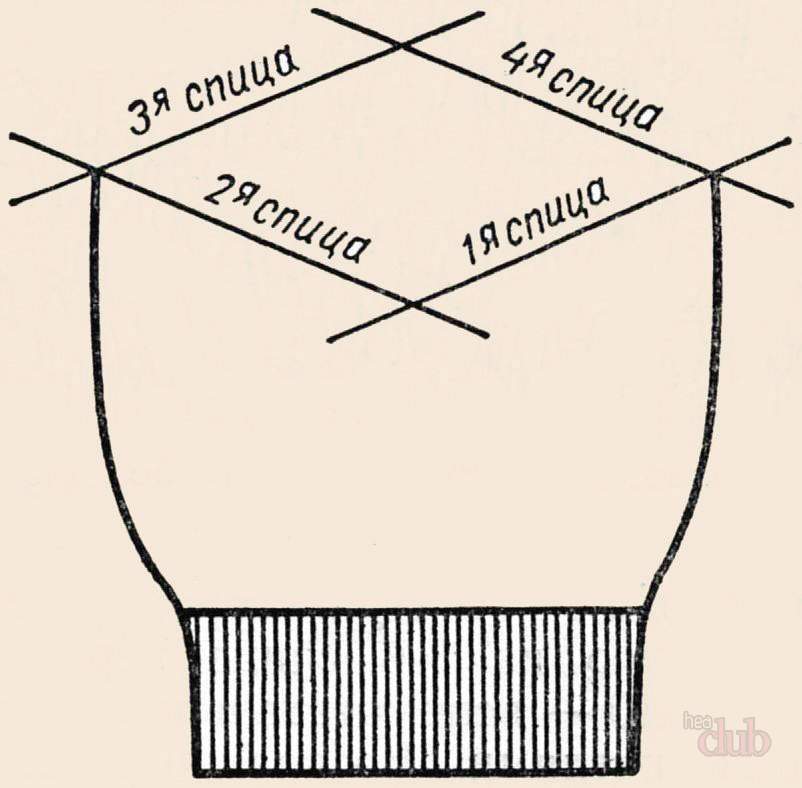 Повторите прибавления еще в 2-х круговых рядах по бокам и распределите петли поровну на 4 спицы.