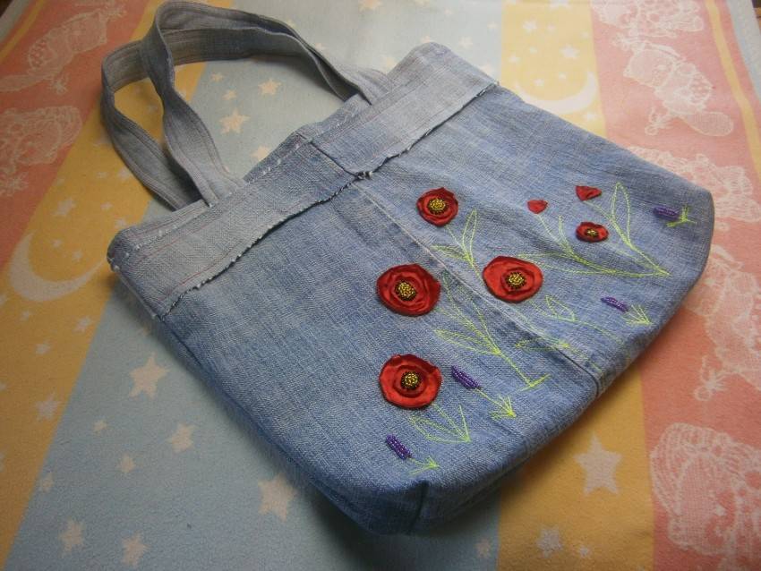 Если не хочется шить сумку из лоскутов, можно выполнить ее из цельного полотна джинсовой штанины. Для украшения изделия подойдет техника ленточного шитья, которая позволяет создавать оригинальные объемные вышивки из атласных лент. Этот метод не считается сложным, поэтому будет по силам даже новичкам.