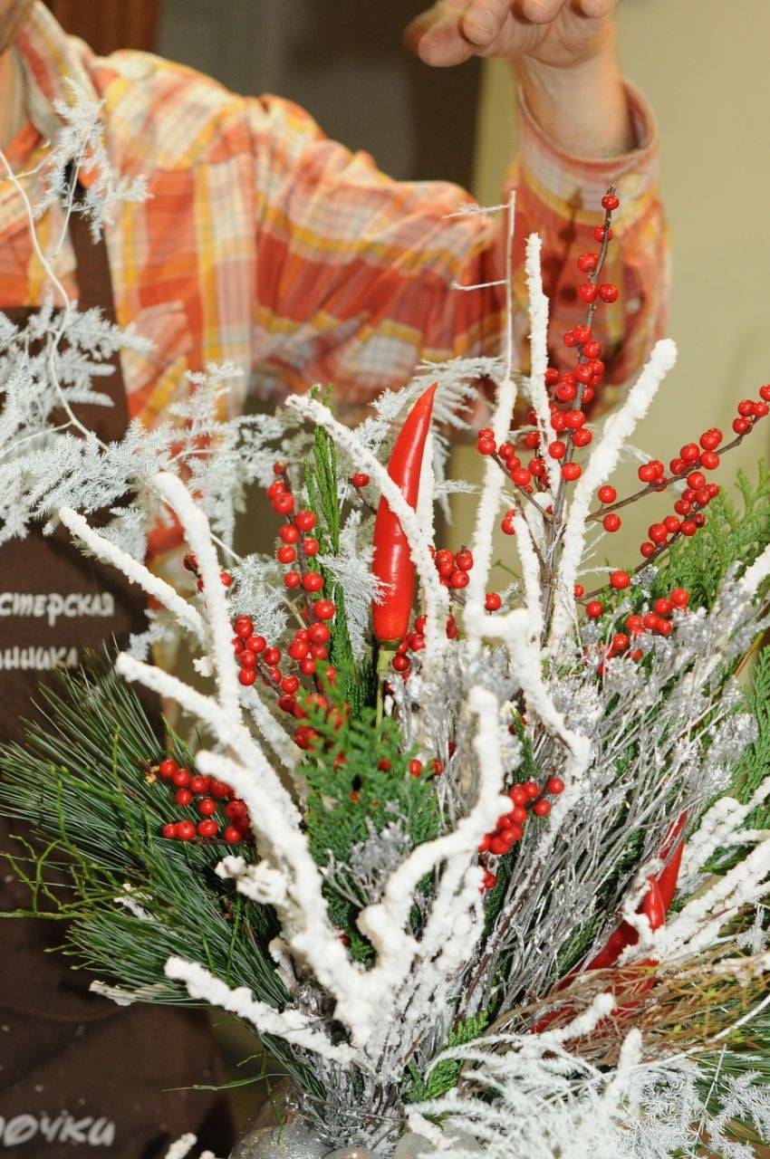 В ней могут сочетаться, казалось бы, не сочетаемые материалы: цветы, лесные ягоды и еловые веточки.