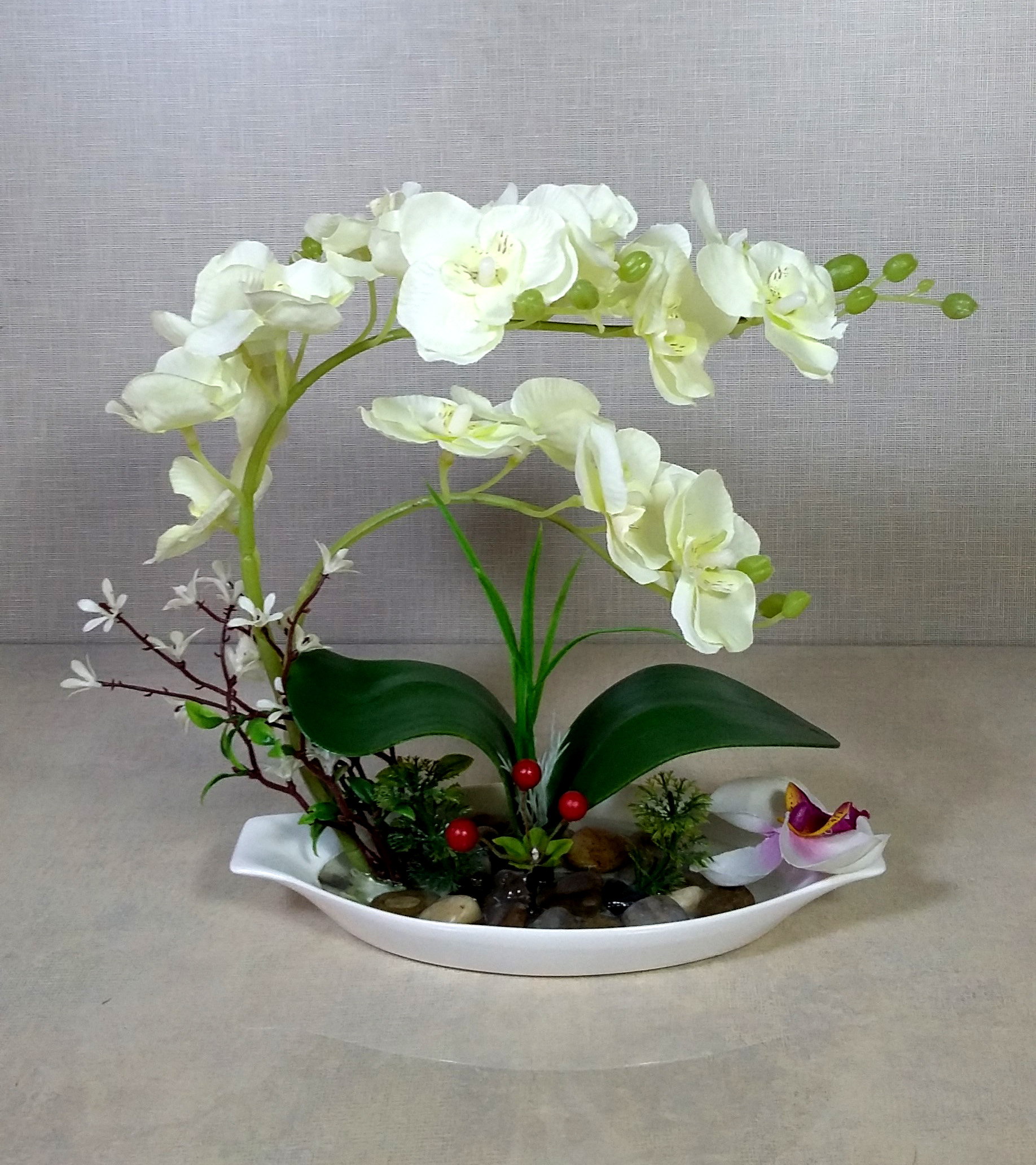 4. Завершаем создание икебаны веточкой тинги, которая должна располагаться между орхидеями с небольшим наклоном в сторону меньшей из них.