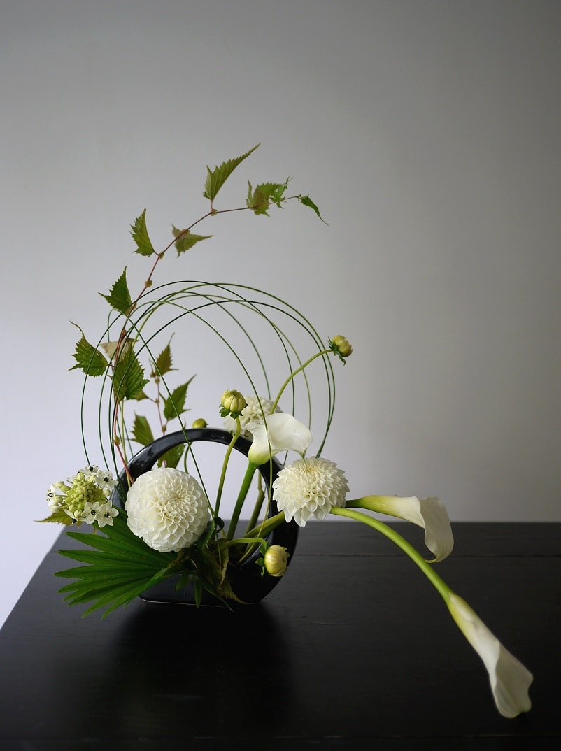- Динамичность расположения. Японский букет должен производить впечатление абсолютно живого организма. В нем не должно быть строгости привычных для россиян букетов. Напротив, все элементы стараются расположить под углом друг к другу, сосуду, поверхности, где будет установлена ваза. Большой любовью у мастеров пользуются необычно изогнутые элементы, позволяющие полнее передать эмоции составителя изящного творения.