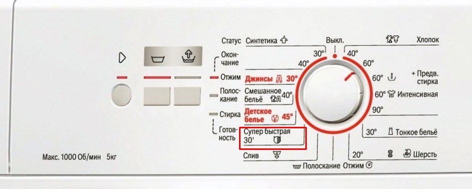 В машинках марки Бош есть функция «Супербыстрая стирка» на 15 и 30 минут.