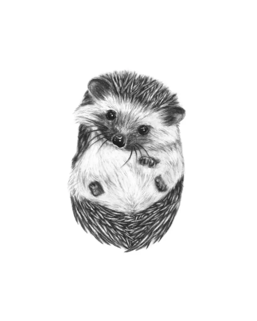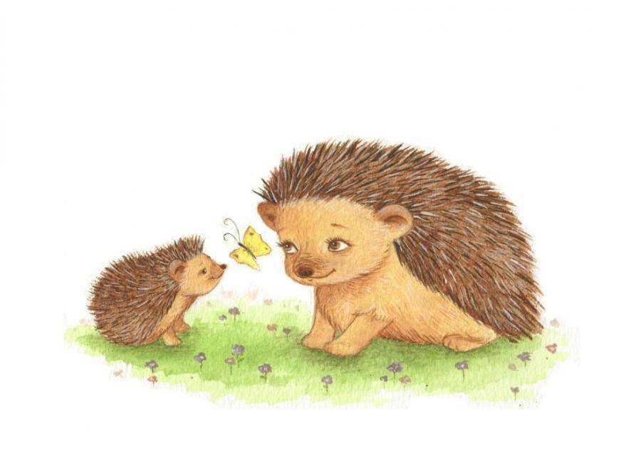 - Рисунок можно дополнить грибочком, яблоком или листом на колючках животного. А вокруг него дорисовать кустики невысокой травы.