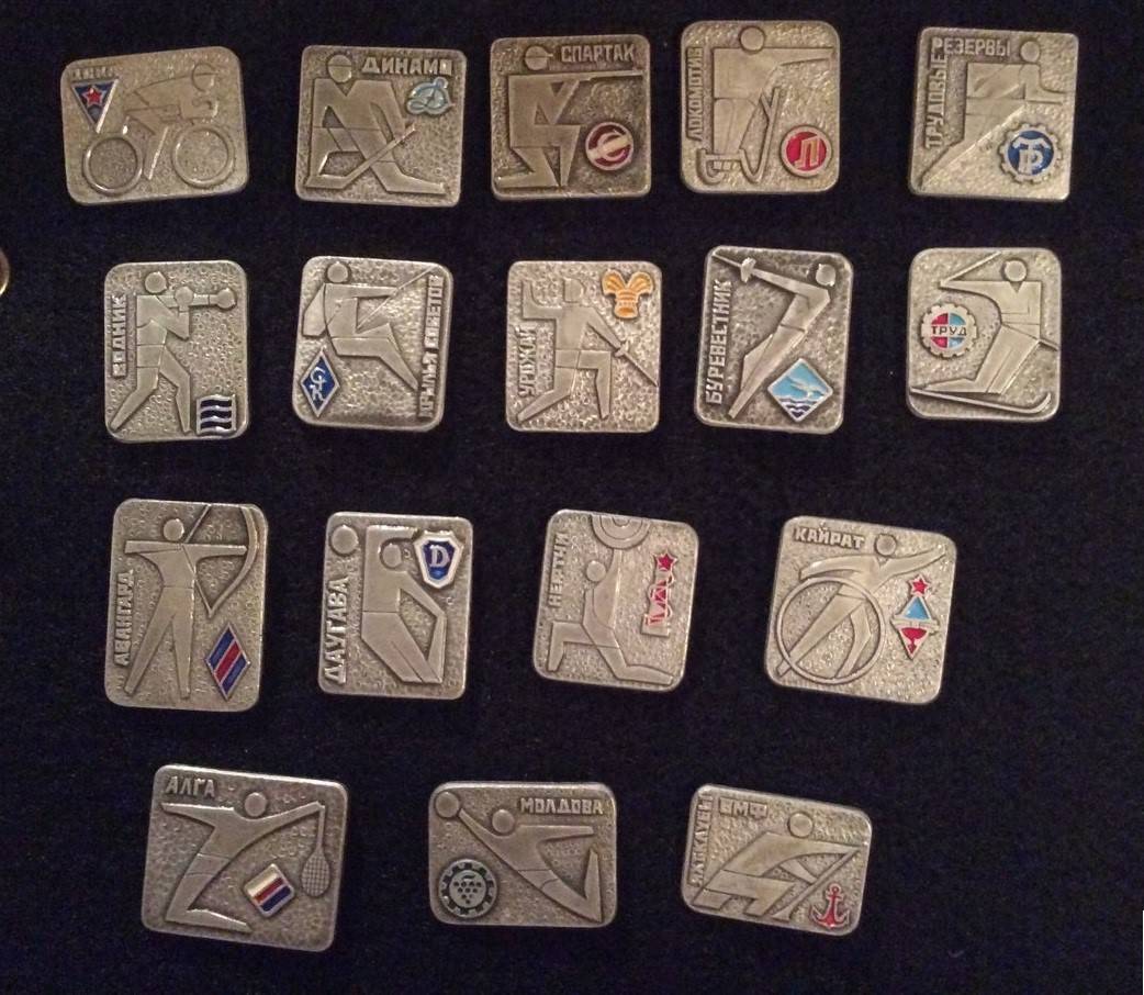 Помимо футбола и хоккея выпуск значков в СССР был сопряжен с Добровольными спортивными обществами – ДСО. Создавались такие общества в 1930-х годах и объединяли преимущественно молодёжь и трудящихся, занимающихся спортом и туризмом. Атрибутами каждого общества были флаг, эмблема, спортивная форма – «цвета» и нагрудный знак. При помощи ДСО популяризировался спорт, здоровый образ жизни, велась подготовка квалифицированных кадров для армии и флота.