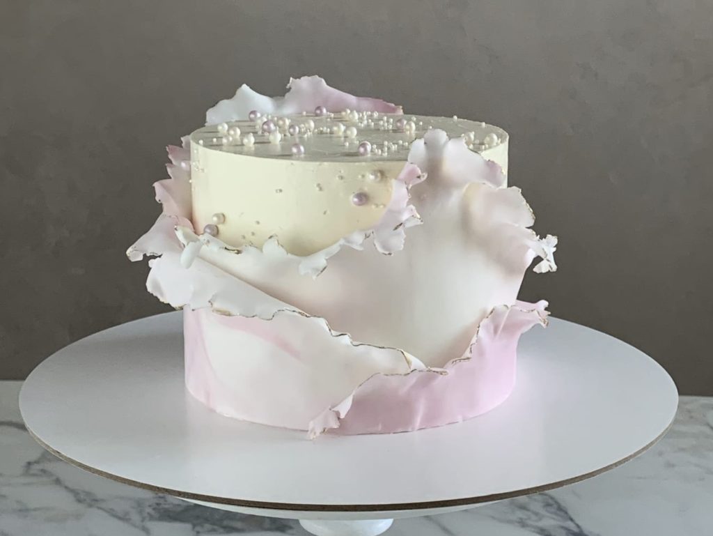 - Снова срезаем остатки мастики по бокам, убедившись, что края мастики достигают подставки торта.