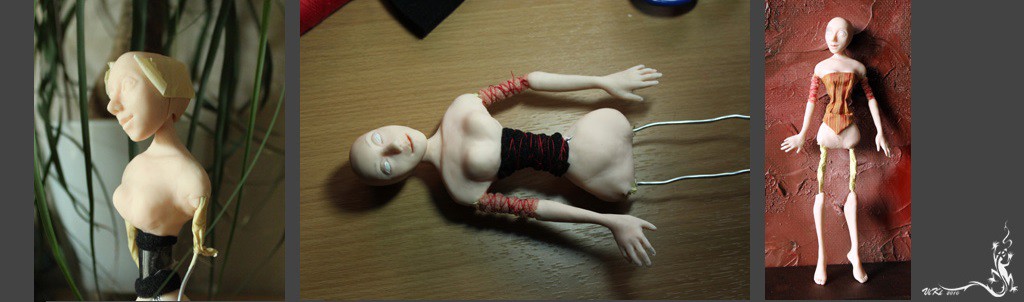 Облепляем каркас пластикой. Лепим тело. Хорошо разглаживаем детали, которые видны. Кукла будет с глубоким декольте.